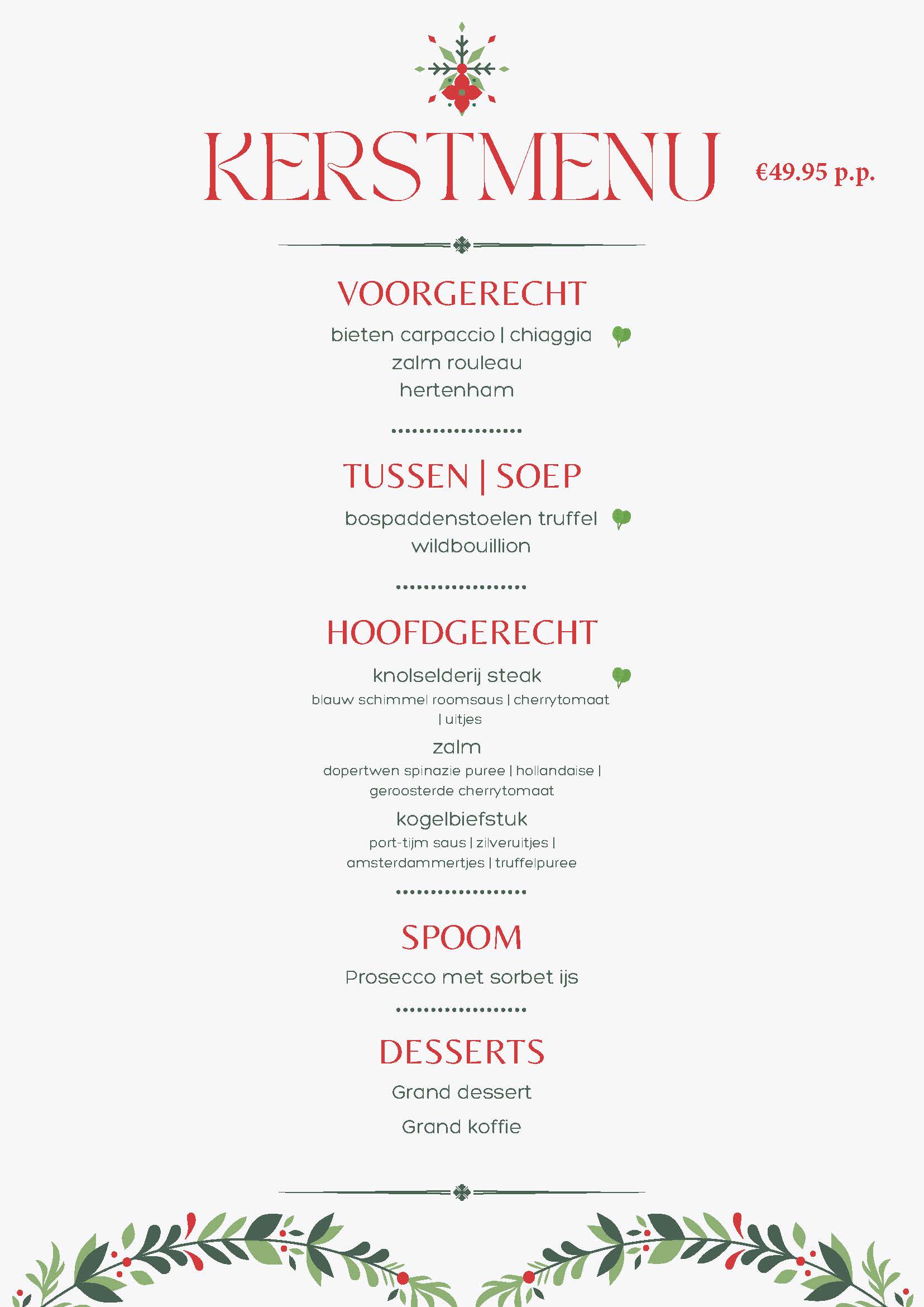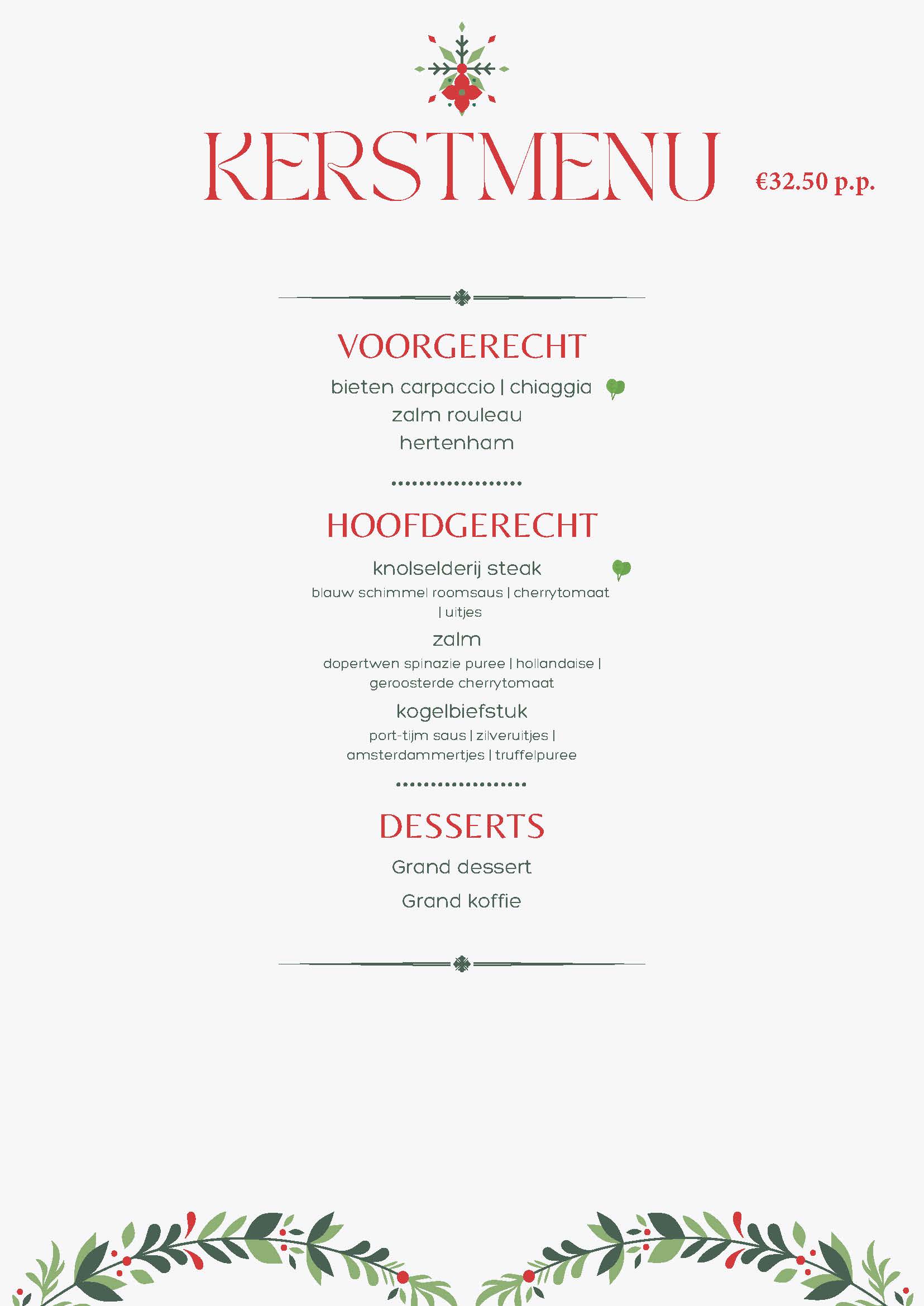 Dit jaar serveren wij twee sfeervolle kerstmenu’s die de magie van de feestdagen naar uw tafel brengen. Kies uit ons klassieke 3-gangen menu (€32,50 p.p.) of laat u verwennen met het uitgebreide 5-gangen menu (€49,95 p.p.), compleet met verfijnde soep en verfrissende spoom.